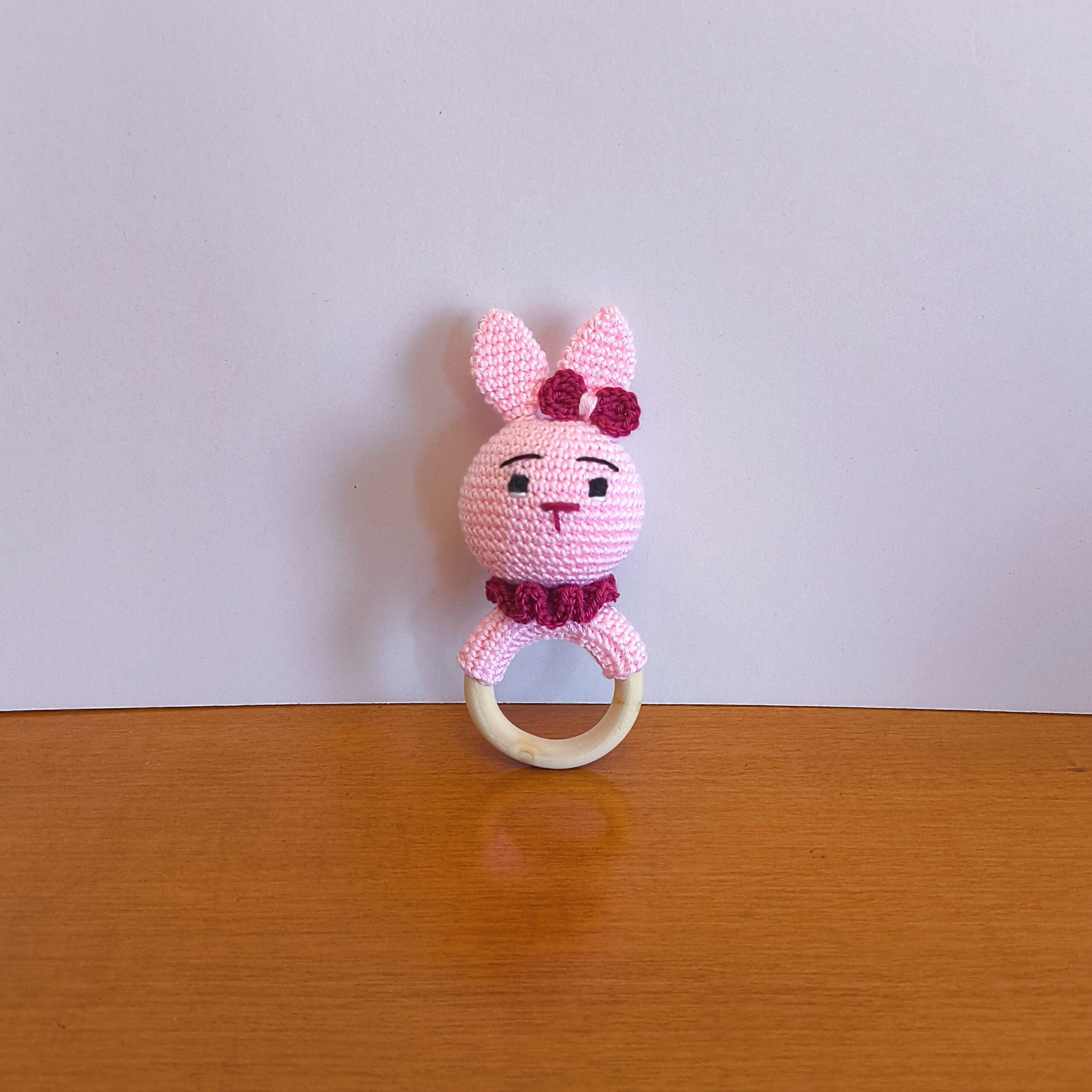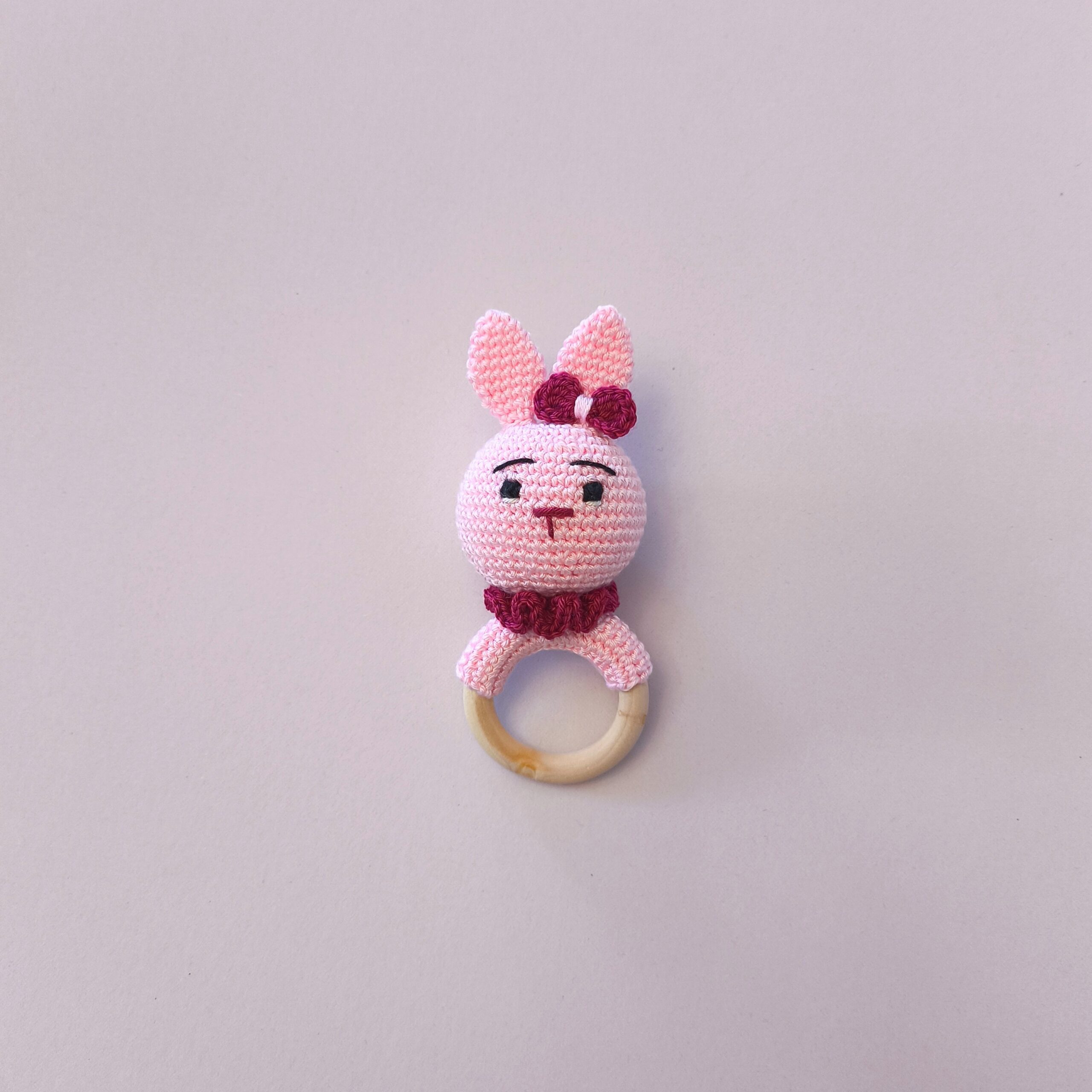 Φτιαγμένο με προσοχή στη λεπτομέρεια και από ασφαλή, απαλά νήματα, αυτό το μικρό λαγουδάκι-κουδουνίστρα είναι ιδανικό για μικρά χεράκια και ανοιχτά στοματάκια που θα μασούν με ευχαρίστηση το ξύλινο μέρος!