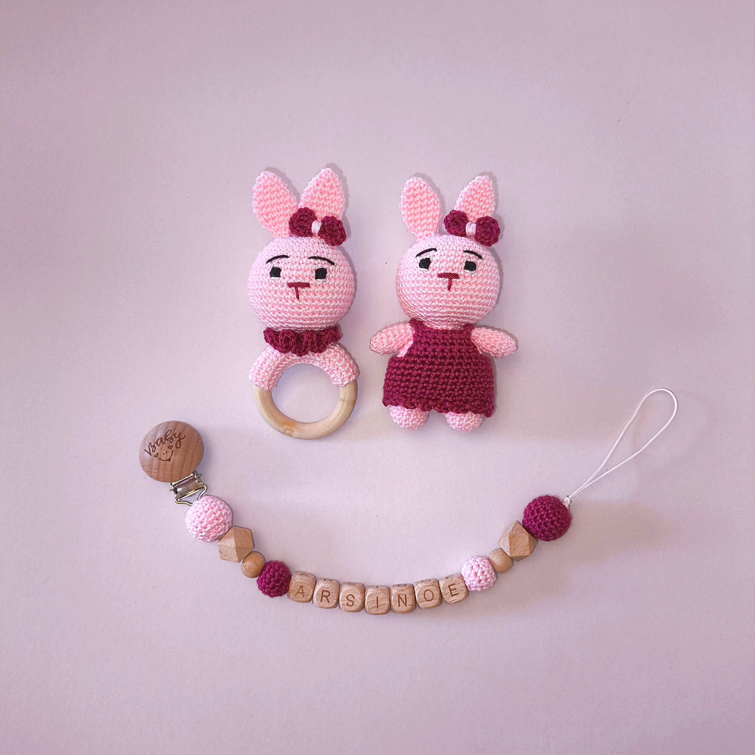 Χειροποίητο πλεκτό σετ λαγουδάκι σε χρώμα ροζ.