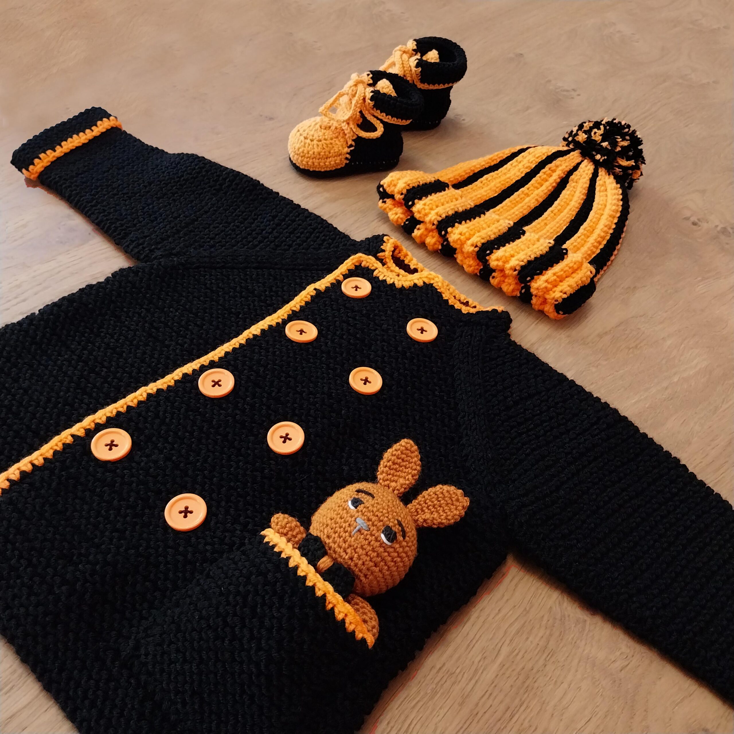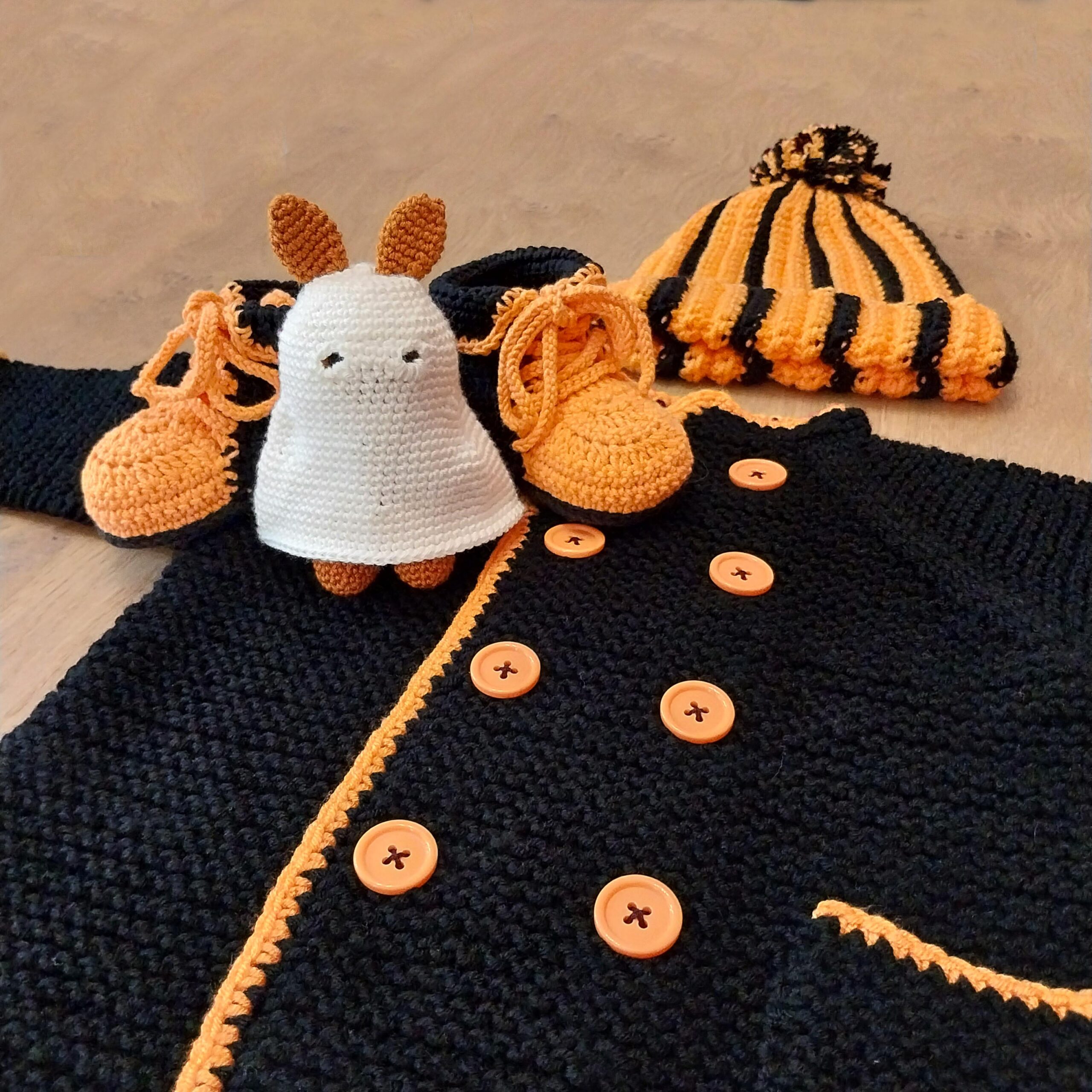 Αυτό το ζεστό σετ είναι ιδανικό για το μωράκι σας για τους φθινοπωρινούς και χειμερινούς μήνες καθώς ταιριάζει απόλυτα με την περίοδο του Halloween. Το λαγουδάκι διαθέτει στολή φάντασμα και είναι πλεγμένο σε μέγεθος που να χωράει στο τσεπάκι της ζακέτας ώστε το μωράκι σας να το έχει πάντα μαζί του!